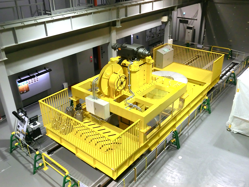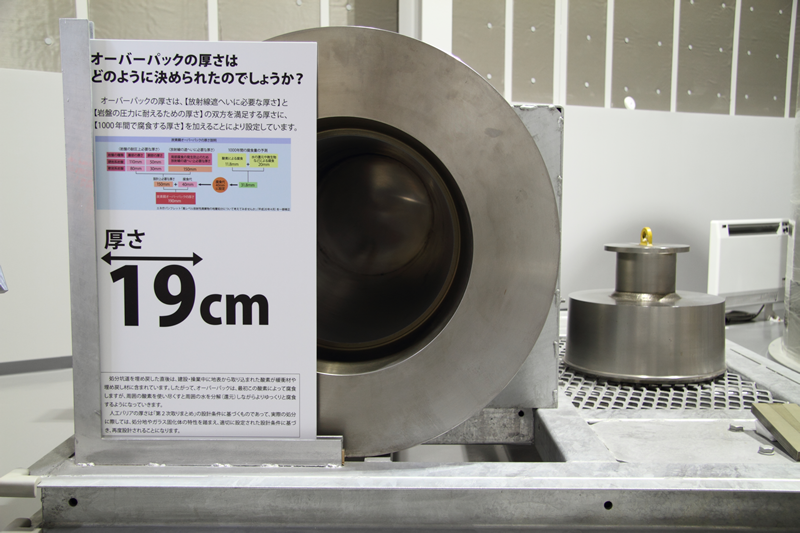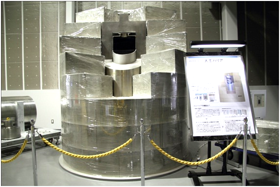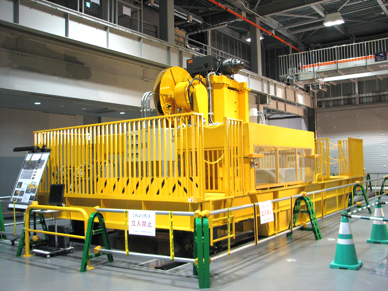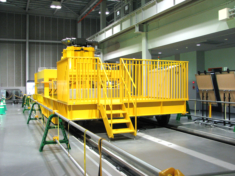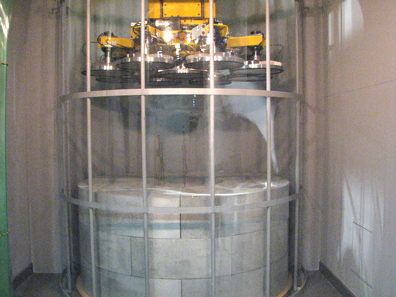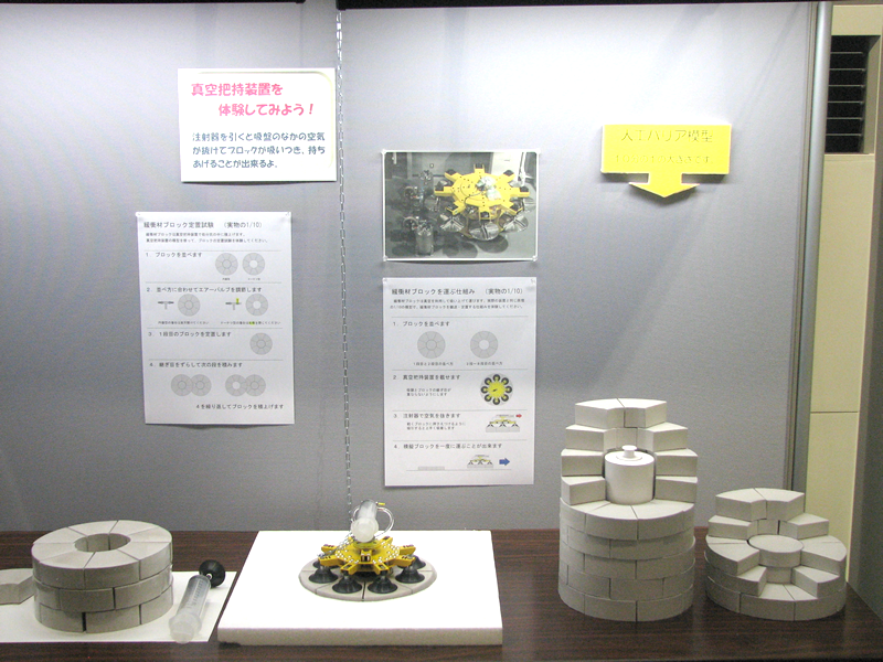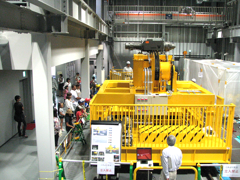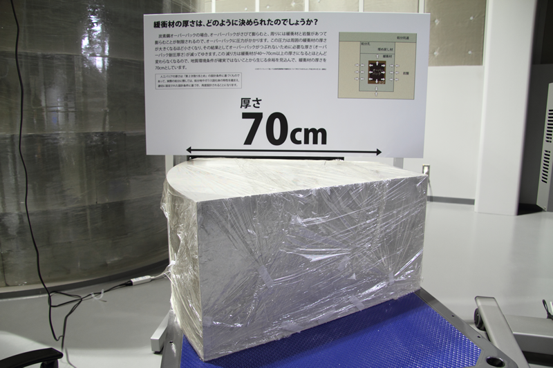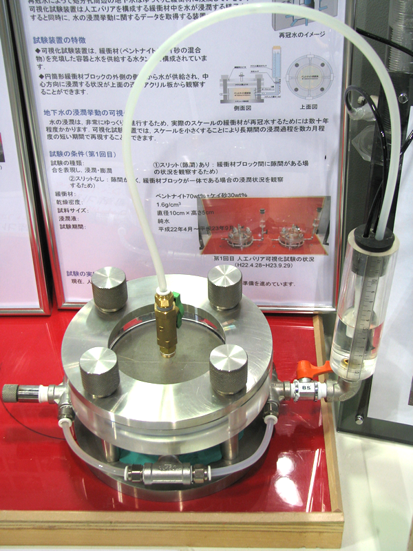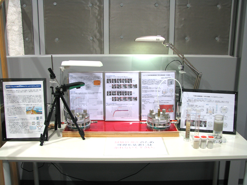 ■展示物のご紹介 人工バリア 実物を体感できます。人工バリアカットモデルは高さ約2.4mです。 緩衝材定置試験装置 緩衝材ブロックを模擬処分孔へ定置する試験を行います。 可視化試験装置 緩衝材への水の浸潤状況を観察・測定します。観察状況はこちらです。